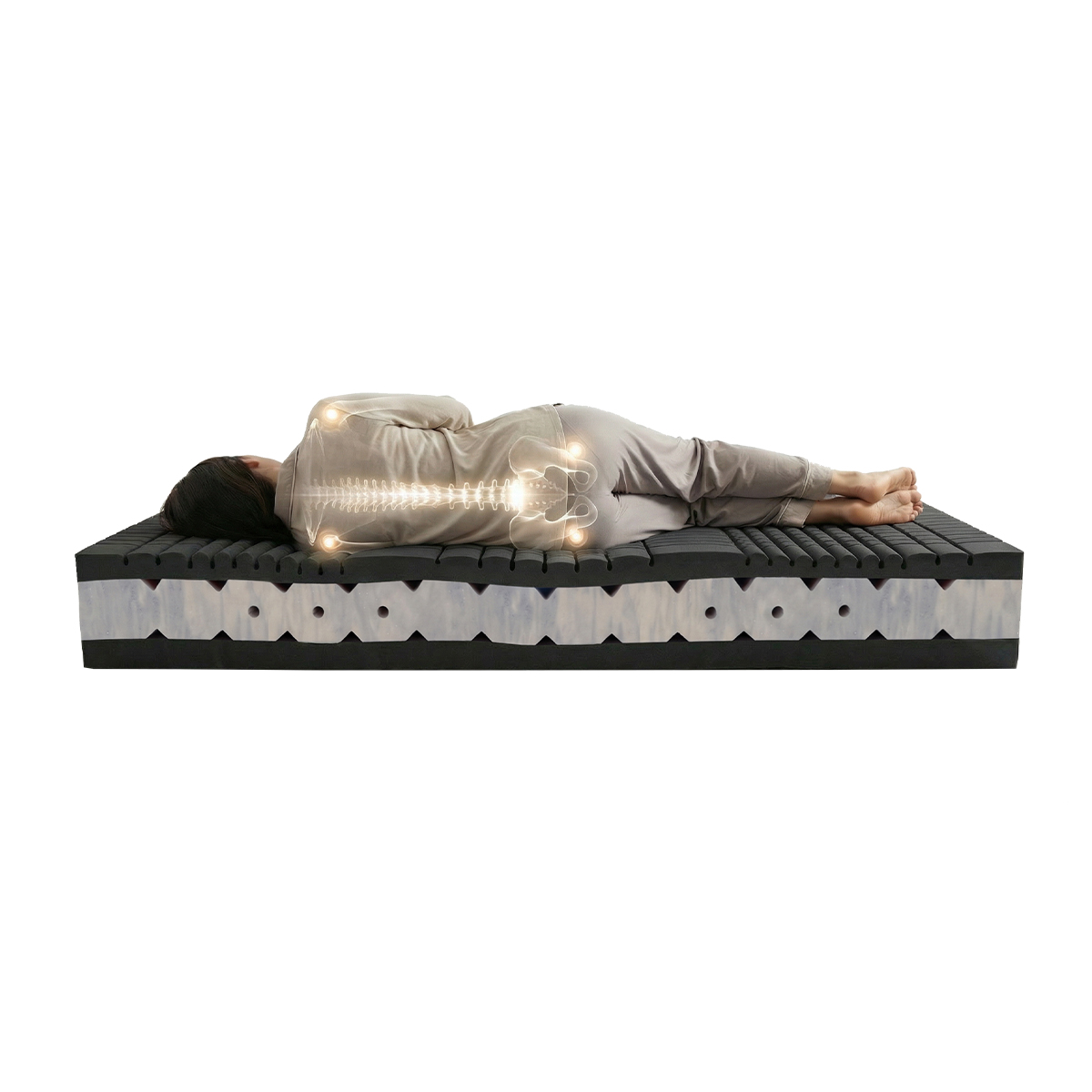 Výsledkem je pocit stability, lehkosti a přirozené rovnováhy po celou noc – bez ohledu na změny spánkové polohy či zatížení.